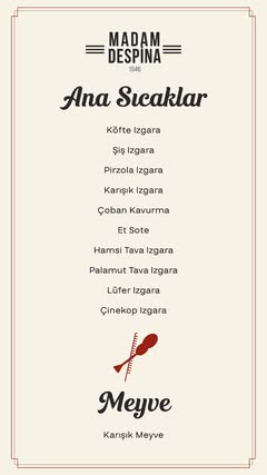 Türkiye’nin ilk kadın meyhane sahibi Despina Kanlı tarafından kurulan Madam Despina, Şişli, Kurtuluş’ta yer almaktadır. Soğuk ve sıcak mezelerin geniş bir yelpazesini sunan meyhanenin en sevilen spesiyaliteleri arasında kızarmış ciğer ve pilaki (zeytinyağında pişirilmiş kızılcık fasulyesi) yer almaktadır. Madam Despina, yıllar içinde kültür ve sanat camiasından birçok kişi için önemli bir yer haline gelmiştir.